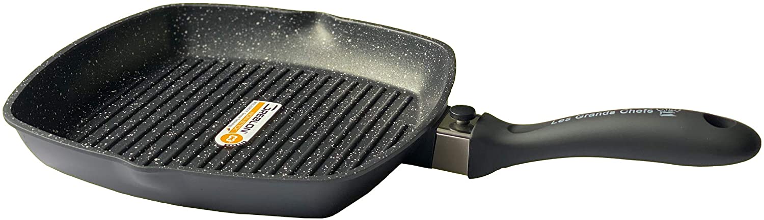 Grill Viande 30×30 cm revêtement antiadhésif renforcé 3 Couches GREBLON C3+ Technologie Allemande sans PFOA – Inclus Manche Amovible – Marque: Les Grands Chefs.