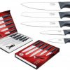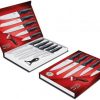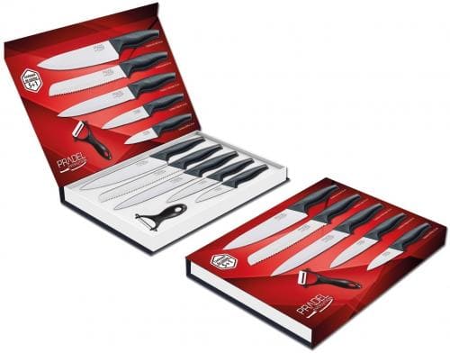 – Un couteau du chef + un couteau à découper + un couteau à pain + un couteau à légume + un couteau d’office + un éplucheur offert en cadeau !