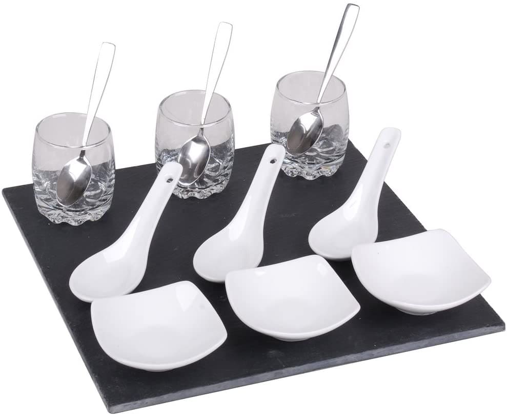 Ce set de dégustation comprend un plateau ardoise pour une belle présentation des verrines. Le coffret comporte également 3 verrines, 3 cuillères en inox, 3 cuillère amuse bouche et 3 petites assiettes carrées. Cet ensemble est parfait pour une dégustation de 3 personnes ou pour effectuer différentes recettes à faire goûter. Cela apporte une belle présentation à la table. L’ensemble est idéal pour les apéros dinatoires en préparant tout à l’avance et passer une agréable soirée.