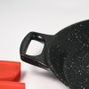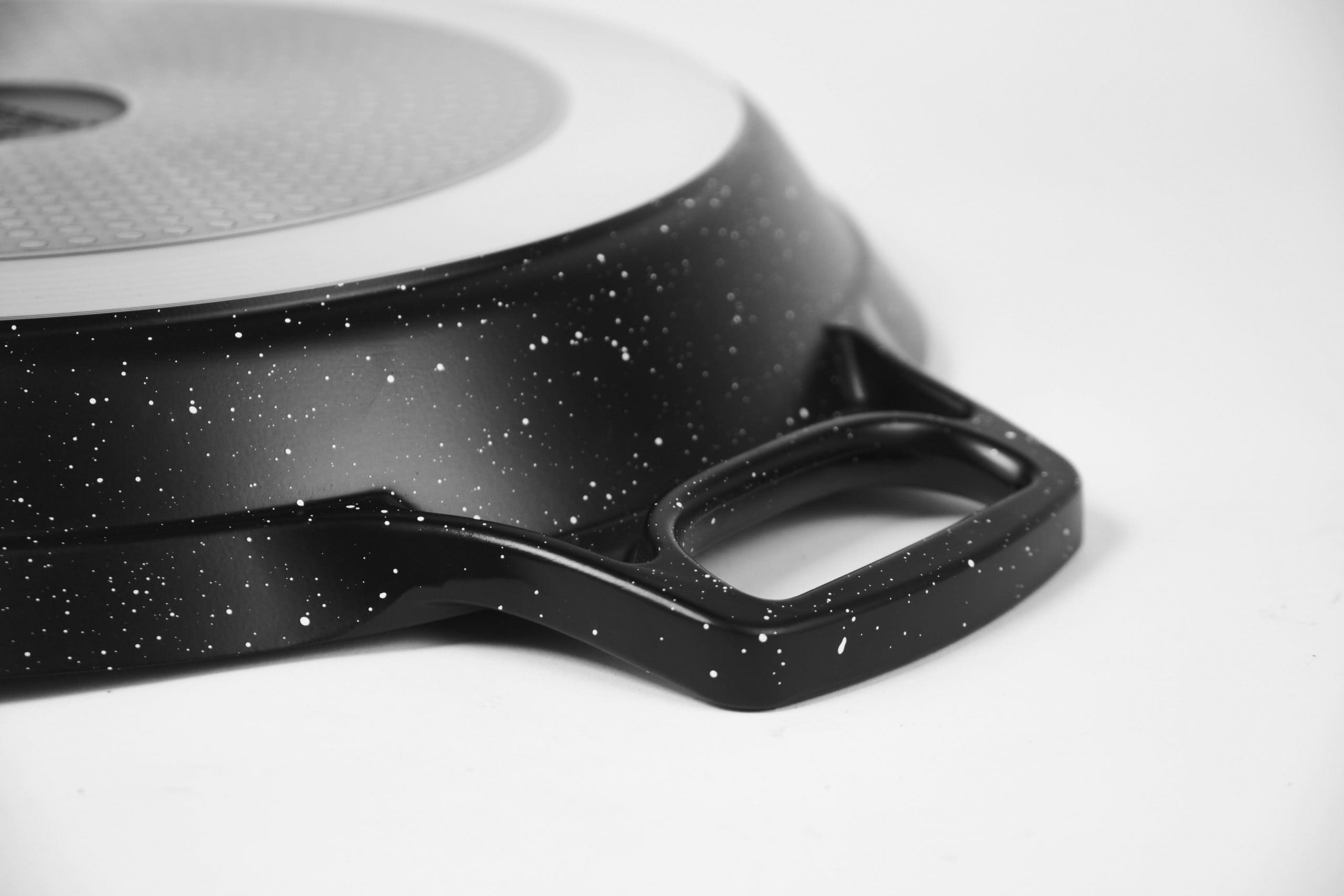 - En fonte d’aluminium avec un revêtement en marbre épais antiadhérent garanti sans PFOA, les matériaux nobles durs comme la pierre pour résister à un usage intensif et aussi aux éraflures.