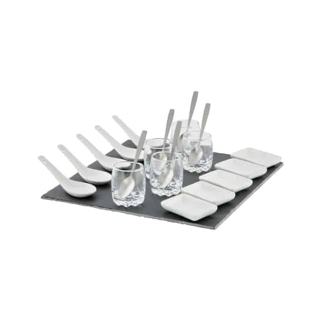 Pour vos réceptions entre amis et en famille, ce set de 25 pièces est un incontournable de l’apéritif. Il vous permet de présenter de manière élégante vos verrines et amuse-bouche afin d’impressionner tous vos convives. Ce set apéritif contient 1 support en ardoise 30 x 30 cm, 6 cuillères en inox, 6 verrines en verre, 6 coupelles rectangulaires et 6 coupelles cuillère. Il deviendra un véritable must-have de vos apéros party ! Les verrines et les cuillères peuvent être lavées au lave-vaisselle alors qu’il est préférable de laver le support en ardoise à la main.