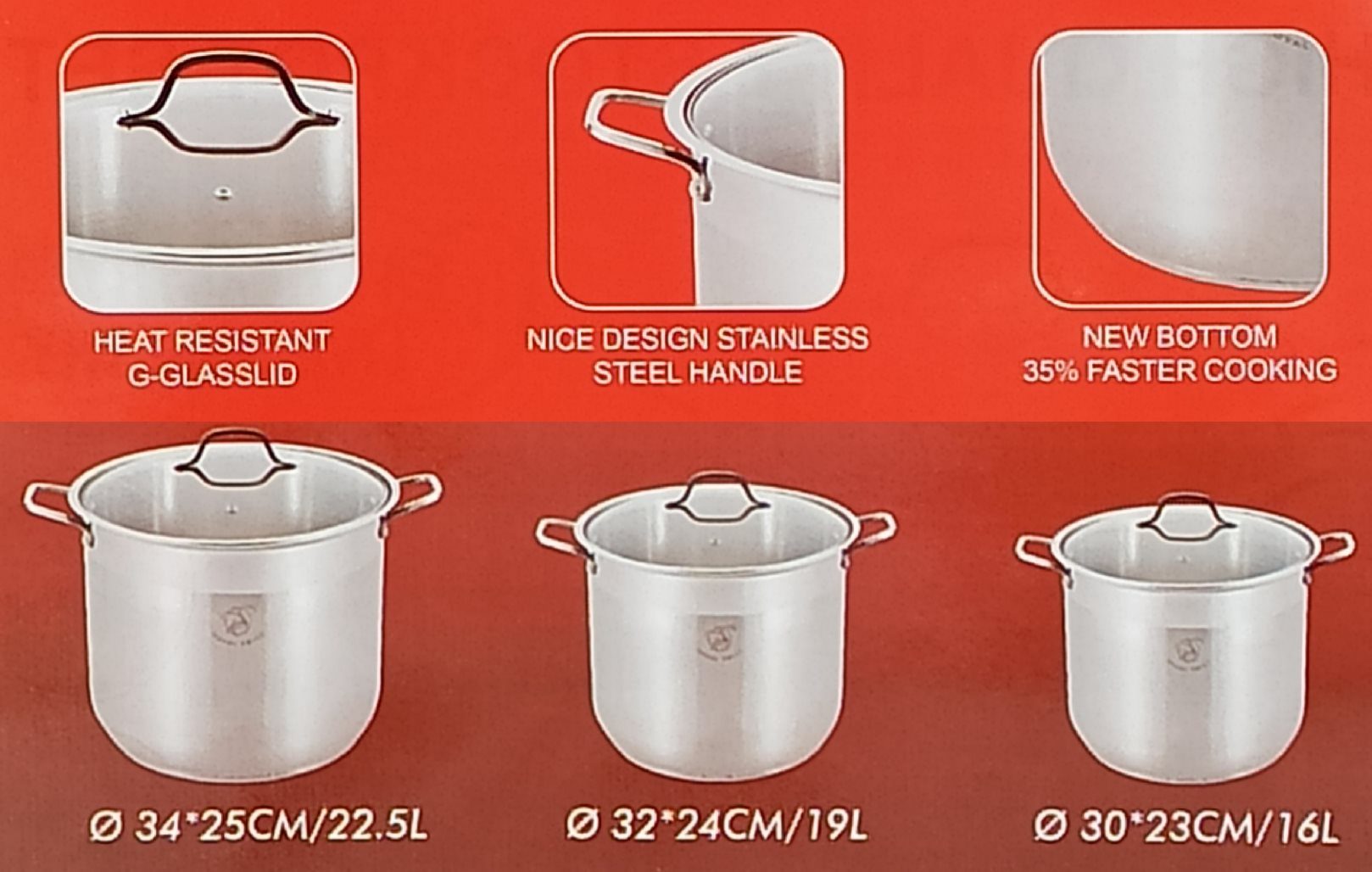 Composition : 1 marmite de 30 cm (16L) / 1 marmite de 32 cm (19L) / 1 marmite de 34cm (22.5L)