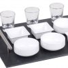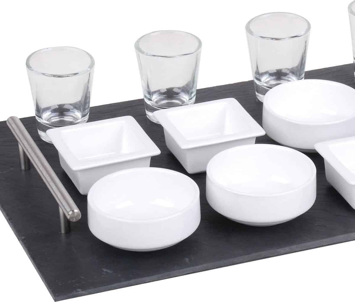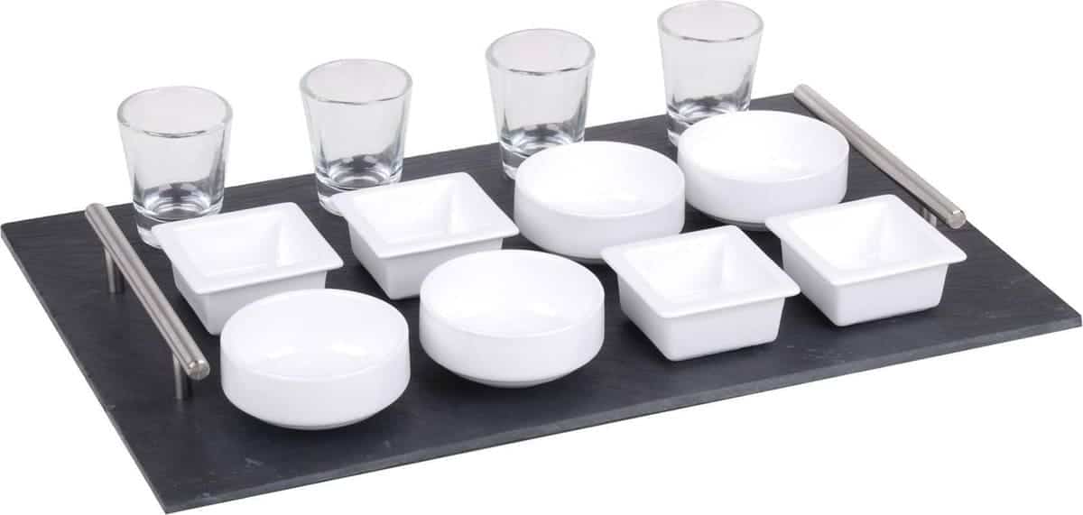 Avec cet ensemble de tapas élégant et tendance, vous servez vos délicieuses collations comme un professionnel et vous ne serez pas dessus du rendu. Les huit bols en porcelaine associés aux quatre verres et à l’assiette en ardoise sont un régal pour les yeux. La porcelaine passe au lave-vaisselle. La planche en ardoise a deux poignées en acier inoxydable et de petits pieds en caoutchouc pour éviter les rayures sur vos meubles et doit être lavée à la main.